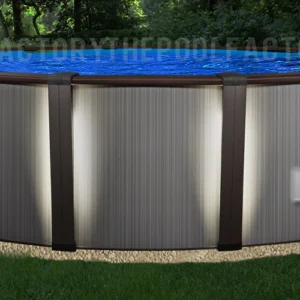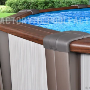 The Daytona introduces textures, colors, angles and even proportions with the introduction of wood patterns through new printing technology. This technology has never been seen before on above ground pools. The Daytona’s structural parts are treated with a double coating of heat setting polyester that ensures a great look for a long time. The top seats are printed with a Walnut pattern and offers a Bronzed steel look with Metallic Highlights. It’s reinforced steel core with anti-corrosion coating of Magnesium, Copper & Aluminum increases rust protection by 72%. Combined with the wall’s graphic, Daytona achieves an unparalleled level of quality.